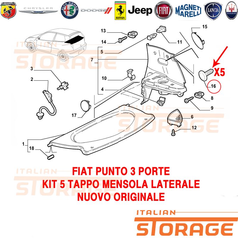 Su italianstorage.com trovi i migliori prezzi sul codice ricambio 735283199: Fiat Punto 3 Porte Kit 5 Tappo Mensola Laterale Cappelliera Nuovo Originale 735283199 del marchio .